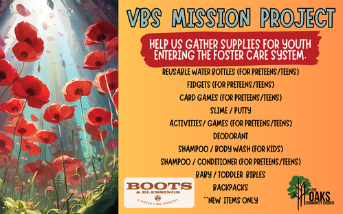 Help us gather supplies for youth entering Foster Care. See graphic below to see what items we are collecting.